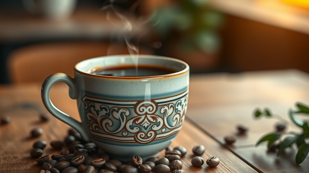 Steaming cup of coffee with aroma, cozy scene on rustic table.